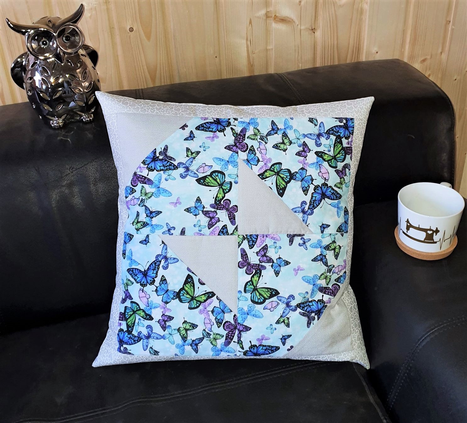Ein dekoratives Patchwork Kissen mit wunderbaren Schmetterlingen und zarten Akzenten in Hellgrau!