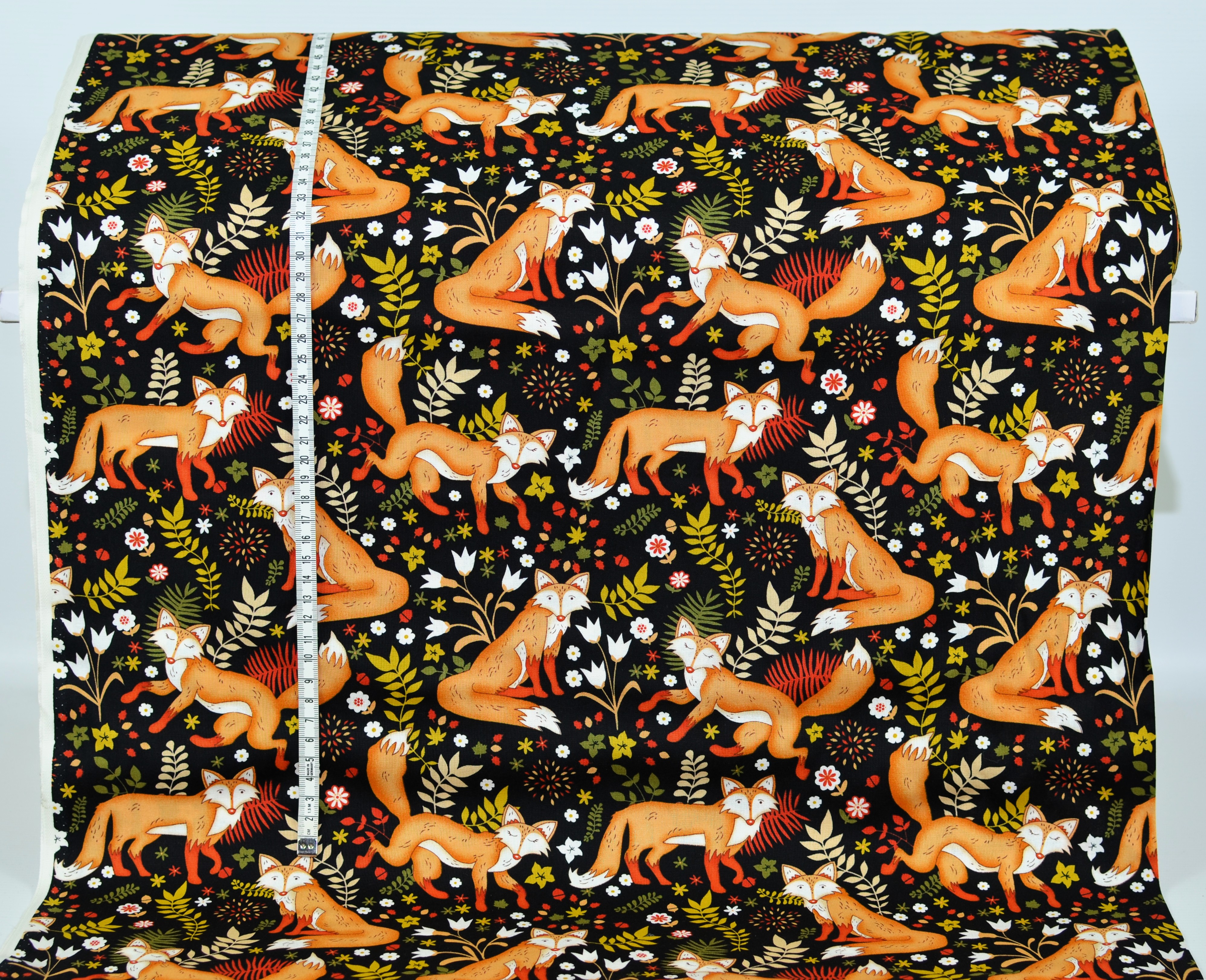 Designer Kinderstoff 100% Baumwolle mit verschiedenen Füchsen und Blumen auf einem schwarzen Hintergrund von Exclusively Quilters Fabrics
