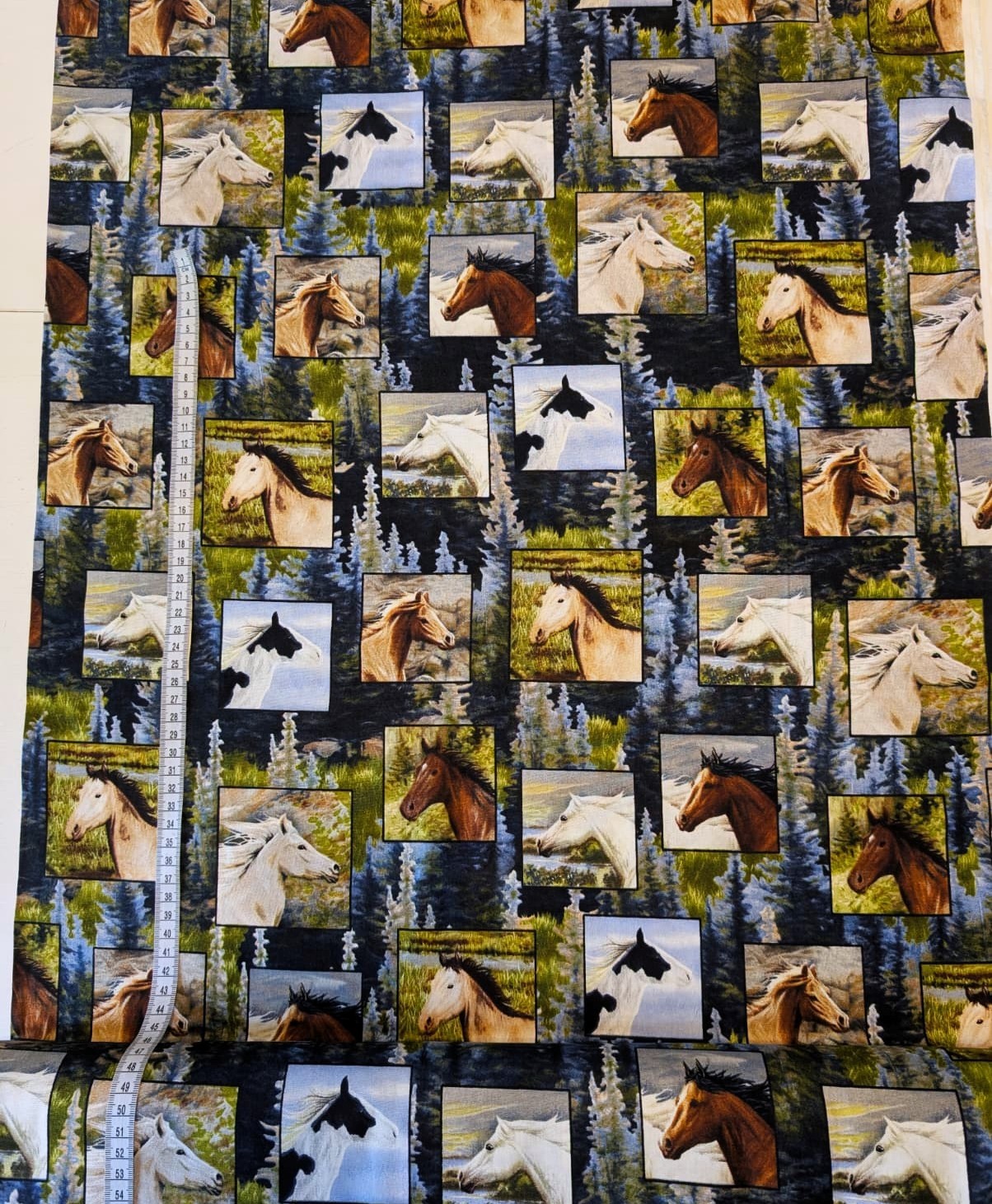 Designer Patchworkstoff aus 100% Baumwolle mit verschiedenen Pferde Motiven auf einem Wald Hintergrund