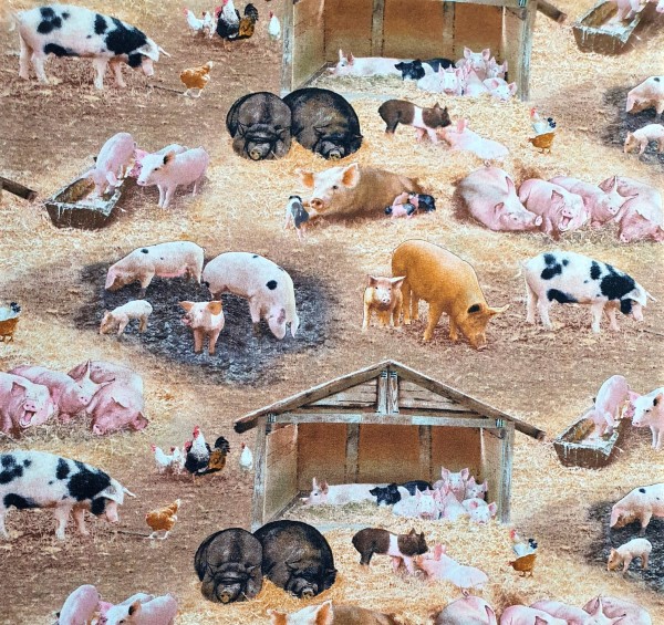 Ausgefallener Patchworkstoff 100% Baumwolle mit Schweinen und Ferkeln aus der Serie "Farm Animals"