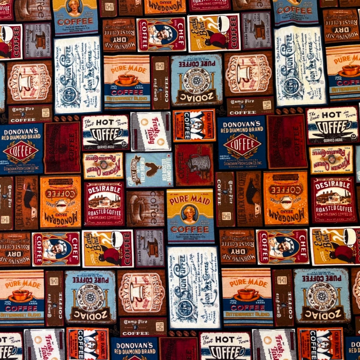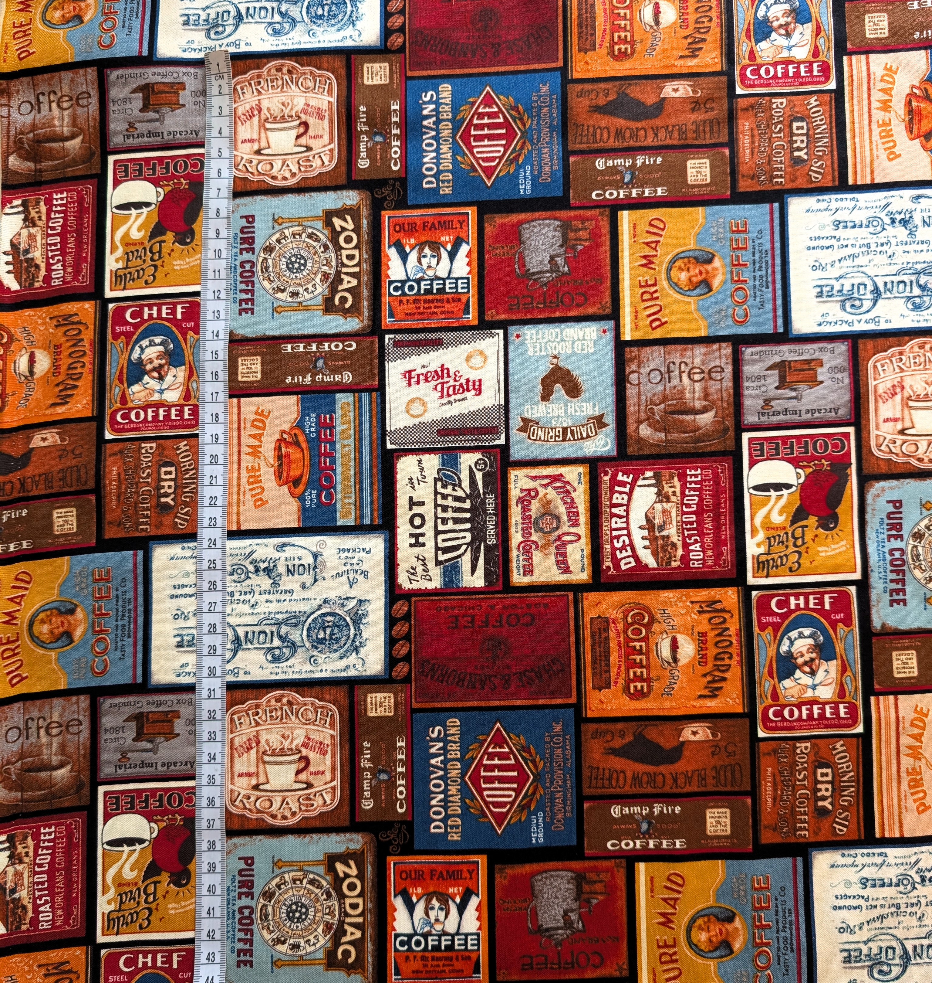 Designer Patchworkstoff 100% Baumwolle mit verschiedenen antiken Kaffeelabeln von Blank Quilting Fabrics